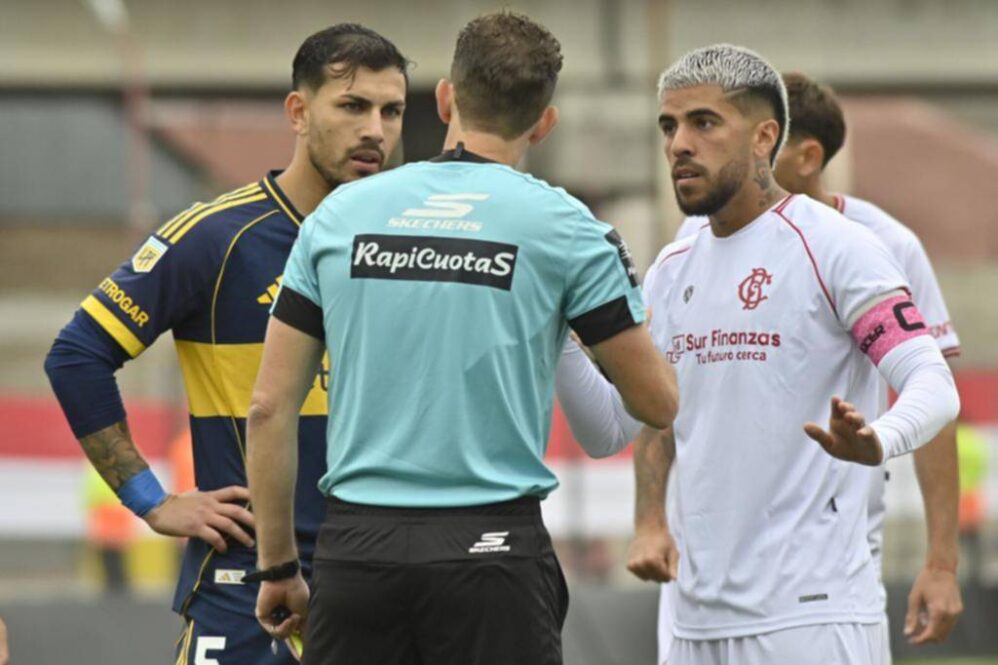 El árbitro, Nicolás Lamolina, muy cerca de la jugada, solo le mostró tarjeta amarilla, lo que generó la reacción de los jugadores de Boca, que entendieron que debió ser expulsado.