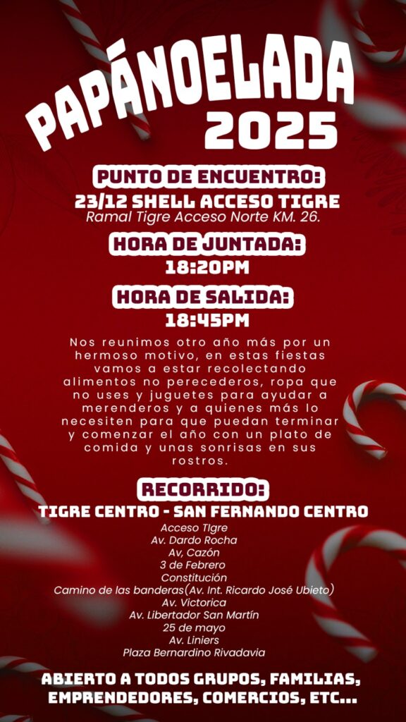 El 23 de diciembre se realizará una nueva edición de la Papanoelada solidaria: una caravana en moto por distintas calles de Tigre y San Fernando destinada a reunir alimentos no perecederos y ropa para quienes lo necesitan en estas fiestas.