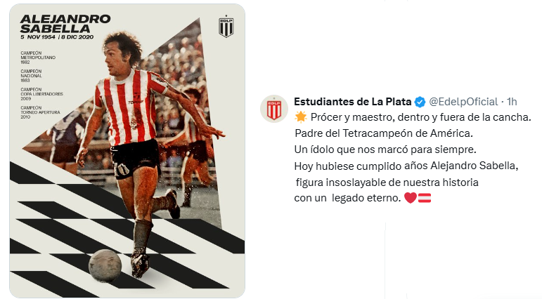 Estudiantes de La Plata recordo hoy, 5 de noviembre, con emocion a Alejandro Sabella, quien habria cumplido 71 anos. El club lo homenajeo en sus redes sociales con un mensaje que sintetiza el sentir de la familia albirroja: “Procer y maestro, dentro y fuera de la cancha. Padre del Tetracampeon de America. Un idolo que nos marco para siempre. Hoy hubiese cumplido anos Alejandro Sabella, figura insoslayable de nuestra historia con un legado eterno”.