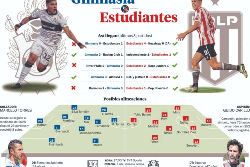Gimnasia llega con seis puntos, producto de dos triunfos como local frente a Racing y Aldosivi; fuera de casa cayó ante River Plate y Barracas Central. Fernando Zaniratto, entrenador del Lobo, registra buenos números desde su regreso: de 14 partidos dirigidos ganó 9 y perdió 5. Asumió en una etapa complicada y, pese a una derrota inicial ante Estudiantes, consiguió una victoria clave en el Monumental que le dio impulso al equipo hasta la semifinal del Clausura, donde cayó frente al clásico rival. Esa serie de resultados añade un componente de revancha para el club y para Zaniratto, cuyo rendimiento en el clásico sigue siendo un punto débil.