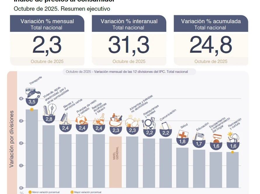 La inflacion de octubre fue de 2,3% y acumulo un incremento interanual de 31,3%.