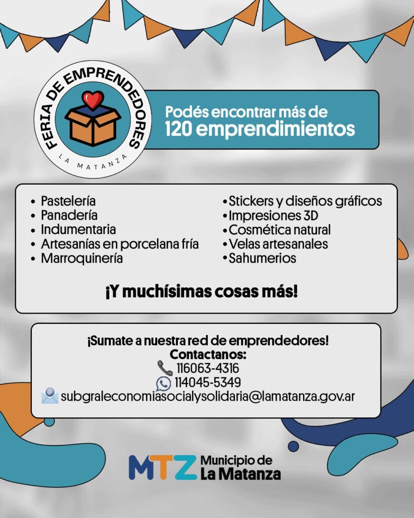 Las personas interesadas en sumarse a la Red de Emprendedores del Municipio pueden solicitar información por WhatsApp al 11-4045-5349 o por correo electrónico a subgraleconomiasocialysolidaria@lamatanza.gov.ar.📍 Agenda Abril 2026