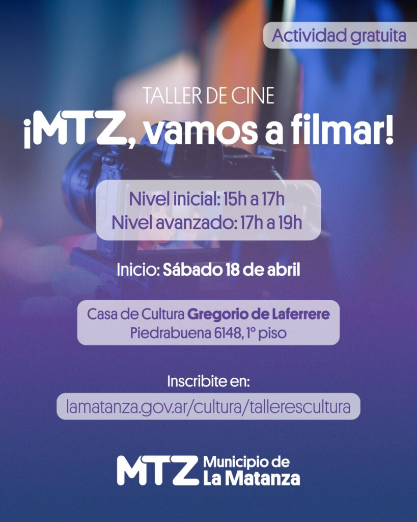 Los talleres MTZ Vamos a filmar para la temporada 2026 son totalmente gratuitos, se ofrecen en dos niveles —Inicial y Avanzado— y se dictan en la Casa de Cultura de Gregorio de Laferrere, ubicada en Piedrabuena 6148, 1° piso. Las personas interesadas pueden inscribirse en lamatanza.gov.ar/cultura/tallerescultura.