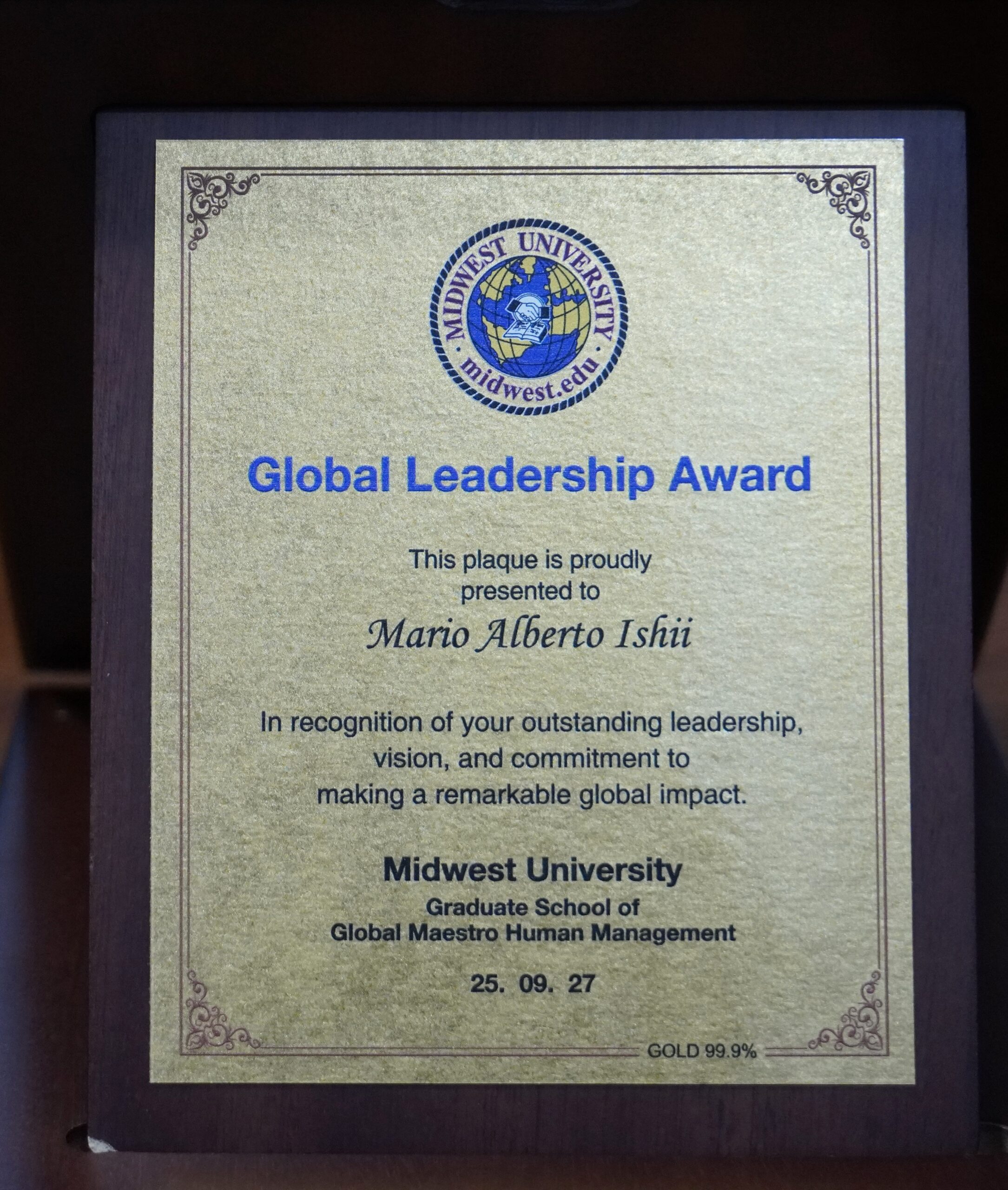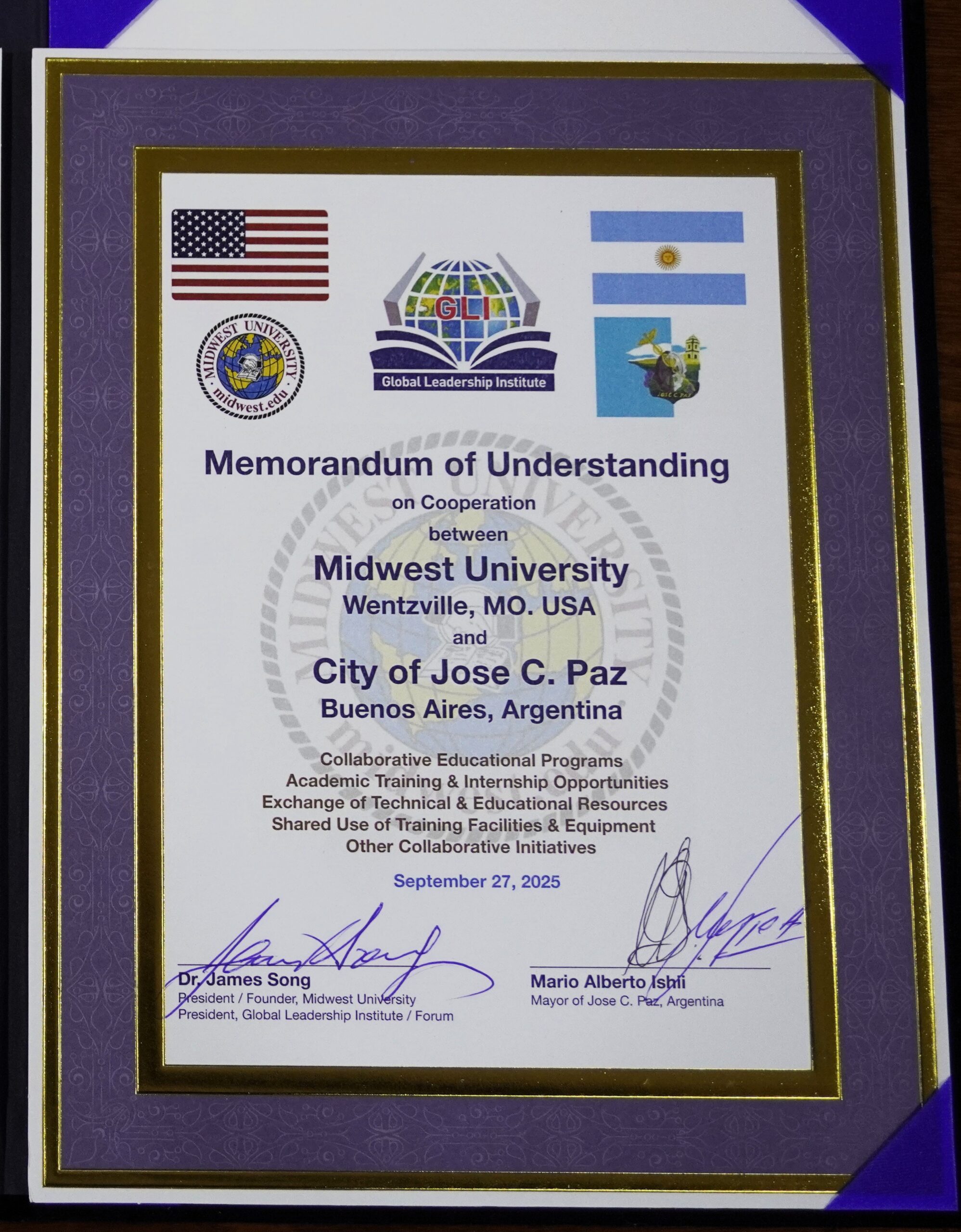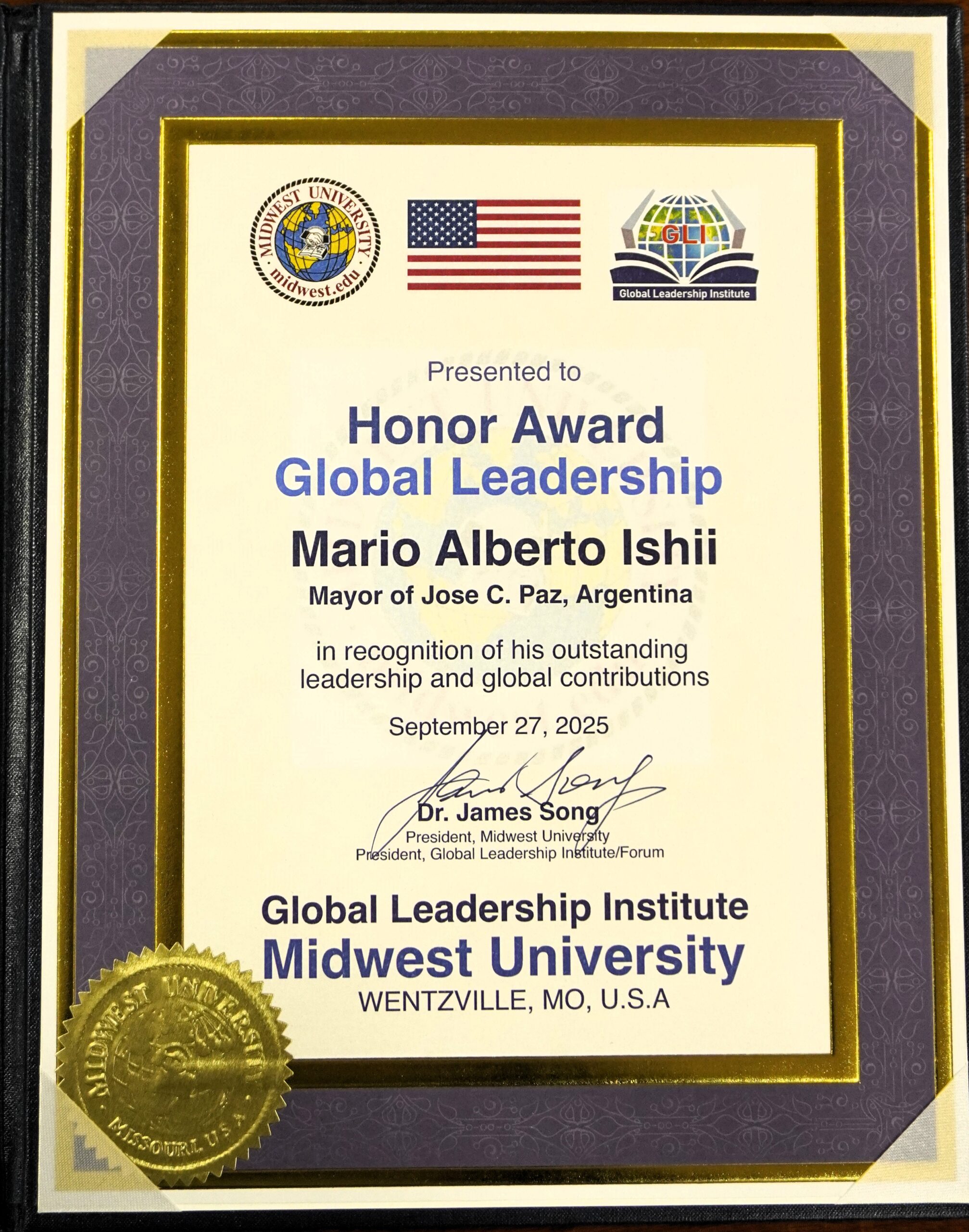 El diploma otorgado expresa: “Presentado a Mario Alberto Ishii, Alcalde de José C. Paz, en reconocimiento de su excelente liderazgo y contribuciones globales”, firmado por el Dr. James Song, Presidente del Instituto de Liderazgo Global/Foro, Midwest University, Wentzville, Missouri, EE. UU., el 27 de septiembre de 2025.