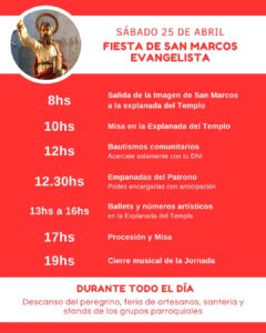 La fiesta de San Marcos Evangelista se conmemora el 25 de abril en honor al autor del segundo Evangelio. A las 10:00 se celebrará una misa y el templo estará en actividad desde temprano. A partir de las 12:00 se realizarán bautismos comunitarios; quienes quieran asistir deben presentarse con su DNI. Las empanadas se venden a 20.000 pesos la docena.