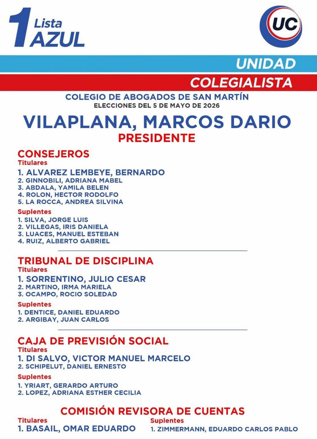 La Lista 1 corresponde a “Unidad Colegialista” y está encabezada por el actual presidente Marcos Vilaplana. Se enfrentará a la Lista 10, “Abogacía Activa”, liderada por Roberto Amantía.