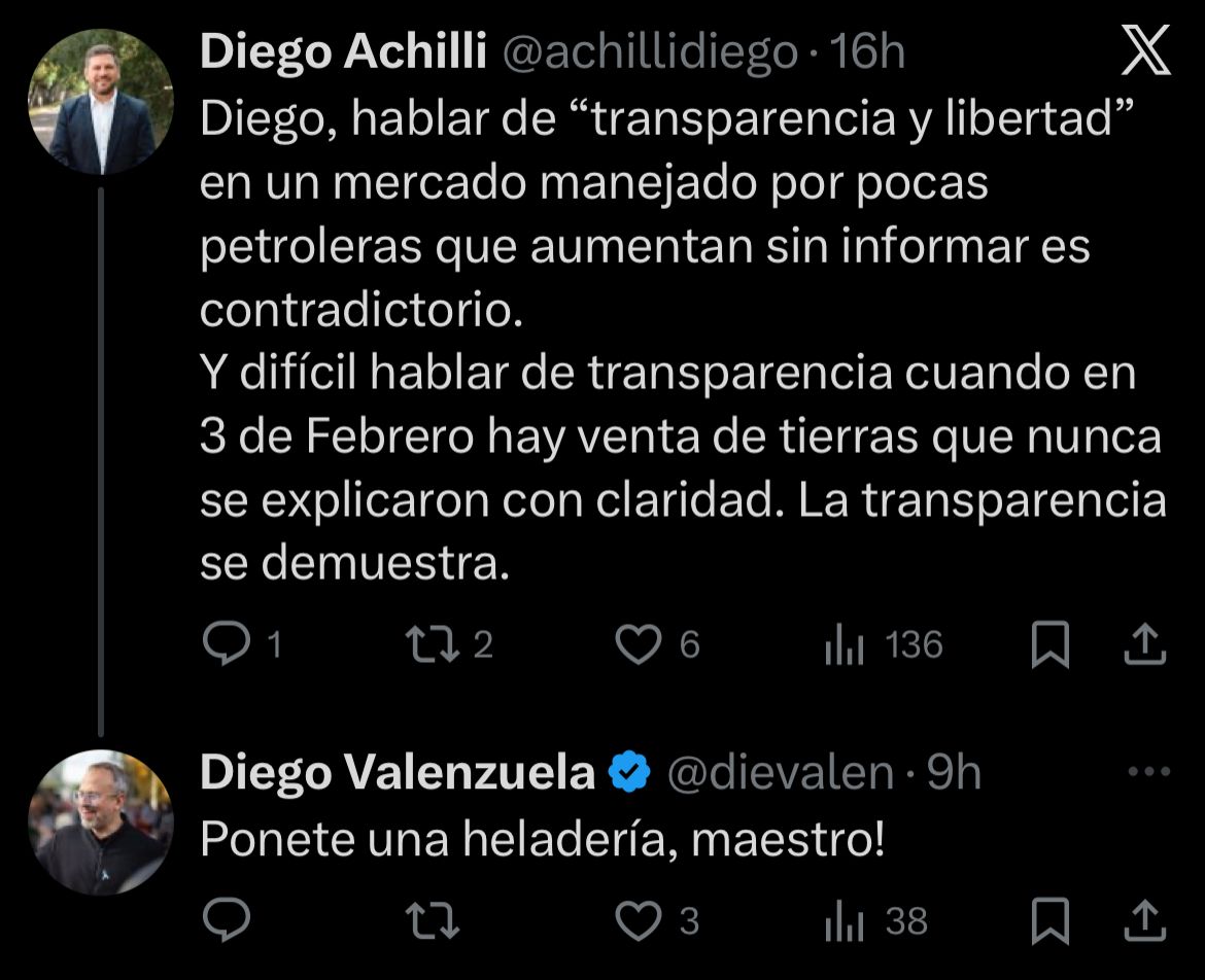 Respecto a la propuesta para lograr mayor uniformidad en los precios, el intendente dijo que las estaciones ya informan sus valores y reportan datos publicamente, por lo que califico el proyecto como un intento de “control politico del mercado” que, en su criterio, aumentaria la burocracia, frenaria la innovacion, desincentivaria la inversion y perjudicaria a quienes buscan expandirse.