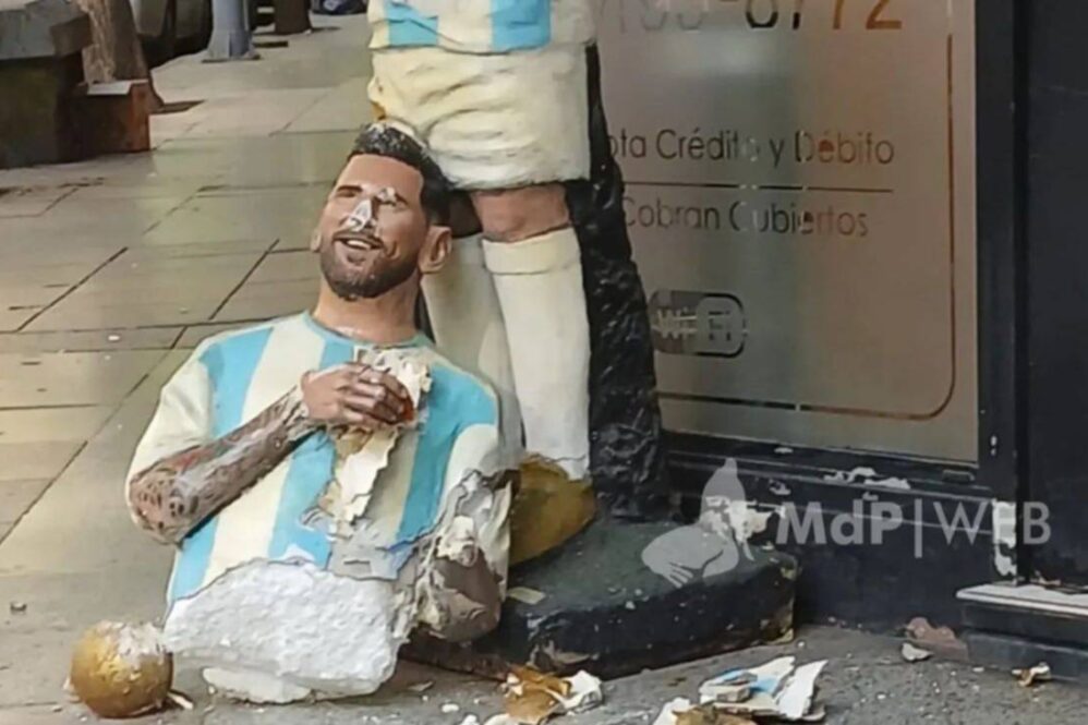Una estatua de Lionel Messi ubicada en la esquina de Moreno y Santa Fe, en Mar del Plata, apareció durante la madrugada del domingo con las piernas arrancadas y daños en el torso. La figura —inaugurada originalmente por un bar local en 2018 y reconstruida en 2024 tras la consagración en Qatar— ya había sido víctima de vandalismo anteriormente, cuando le decapitaron el busto.