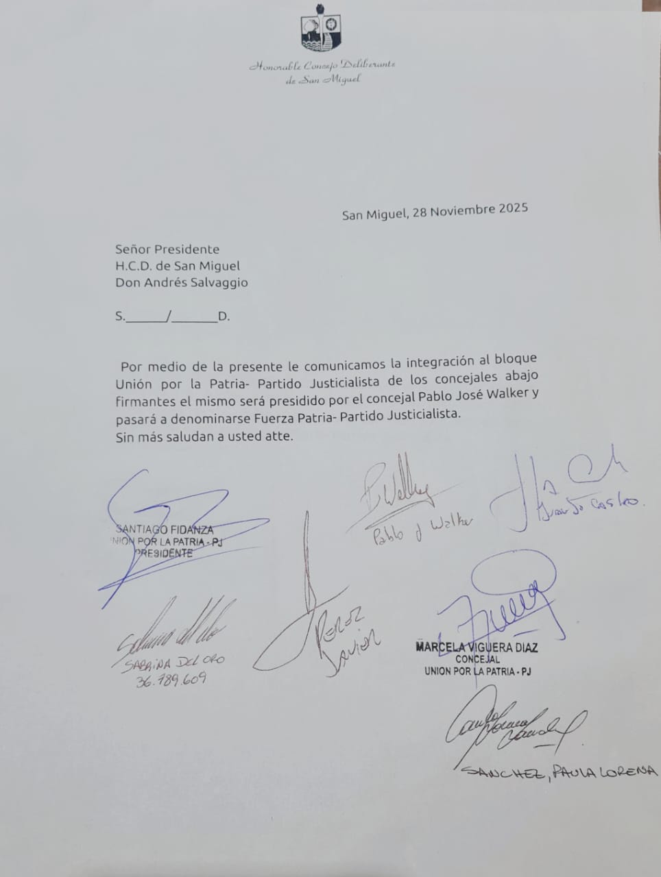La presentación al presidente del cuerpo incluyó las firmas de Juanjo Castro; Pablo Walker (jefe de bloque); Marcela Viguera Díaz (La Cámpora); Santiago Fidanza (La Patria Es El Otro); Javier Pérez (La Bancaria), que hasta ahora integraba un monobloque; y Paula Sánchez y Sabrina Del Oro (ambas de La Porta), que también tenían bloque propio.