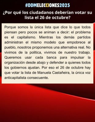 Con respecto a la votación del domingo 26 de octubre, el candidato del Movimiento Avanzada Socialista calificó que es “la única lista que dice lo que todos piensan, pero pocos se animal a decir: el problema es el capitalismo”. “No vivimos de la política, vivimos de nuestro trabajo”, aclaró Correa.