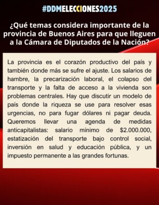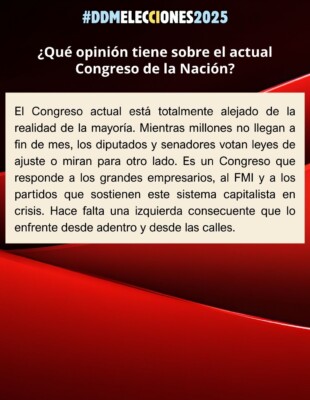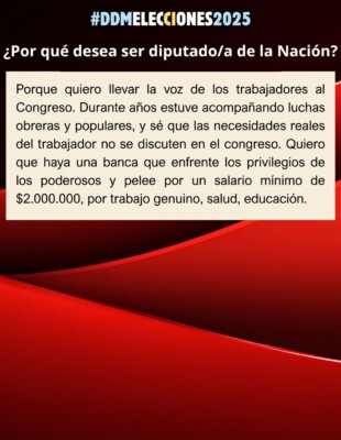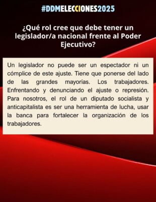 En este sentido, consideró que los legisladores tienen que “enfrentar y denunciar el ajuste o represión” provocado por el Ejecutivo Nacional. “El rol de un diputado socialista y anticapitalista es ser una herramienta de lucha y para fortalecer la organización de los trabajadores”, continuó.